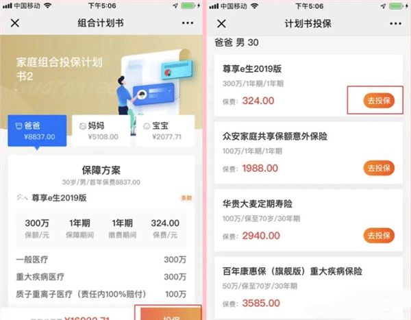 客户在微信端打开计划书后,浏览完毕即可直接点击“投保”按钮,随后在微信端为每个被保人依次完成投保流程。
