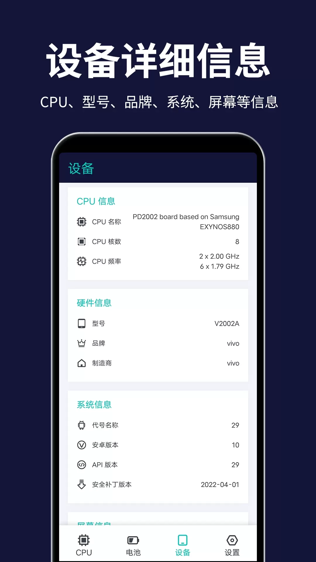 呈现CPU的型号与品牌、系统的版本以及屏幕参数等方面的硬件信息。