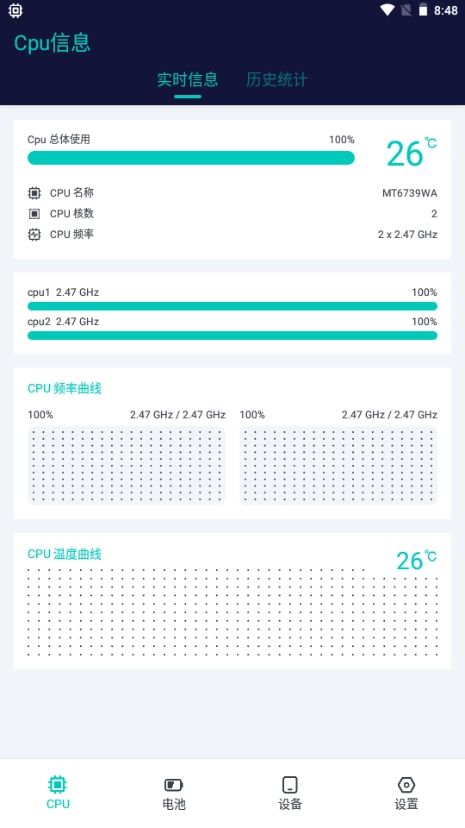 CPU设备信息软件里最关键的功能当属CPU实时监控,在排查手机异常状况时特别实用,毕竟我们可以从变化曲线中直观地找出问题根源。此外,使用这款CPU设备信息工具无需进行root操作,大大保障了手机的安全性!
