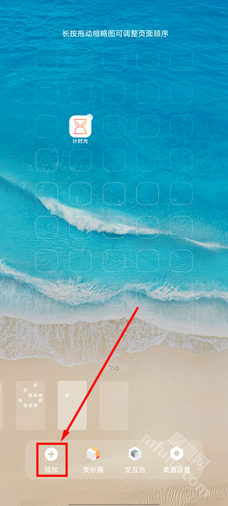在手机桌面页面上,用双指捏合或者长按空白区域,就能进入桌面编辑状态。接着,你要找到标有【添加】的按钮,点击它继续操作。