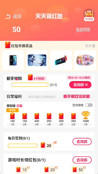 同时也推出了签到活动,用户可以通过参与这些活动或者完成各类任务来获取金币和红包。