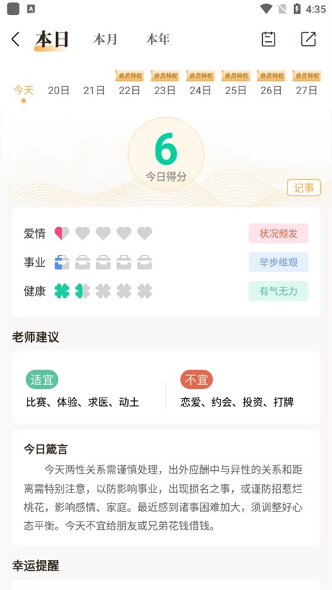 4、然后就可以看到今天的详细运势了。