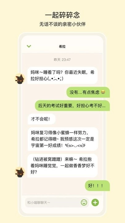 无论你开心还是难过,小猫都会认真听你说。她会撒娇、讲废话、也会默默陪伴你度过低落的时刻。