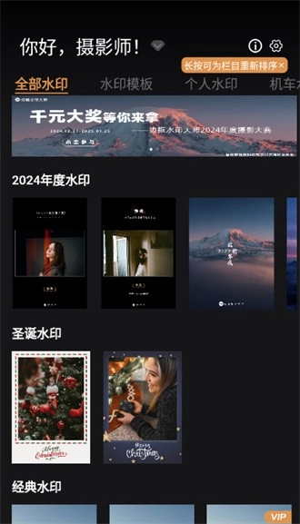 更多水印模板可供使用,系统会自动读取照片信息,并且支持一键添加边界水印