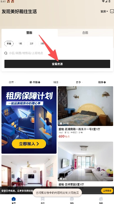 在首页选择整租或合租,接着设置户型、位置等条件,之后点击“查看房源”。