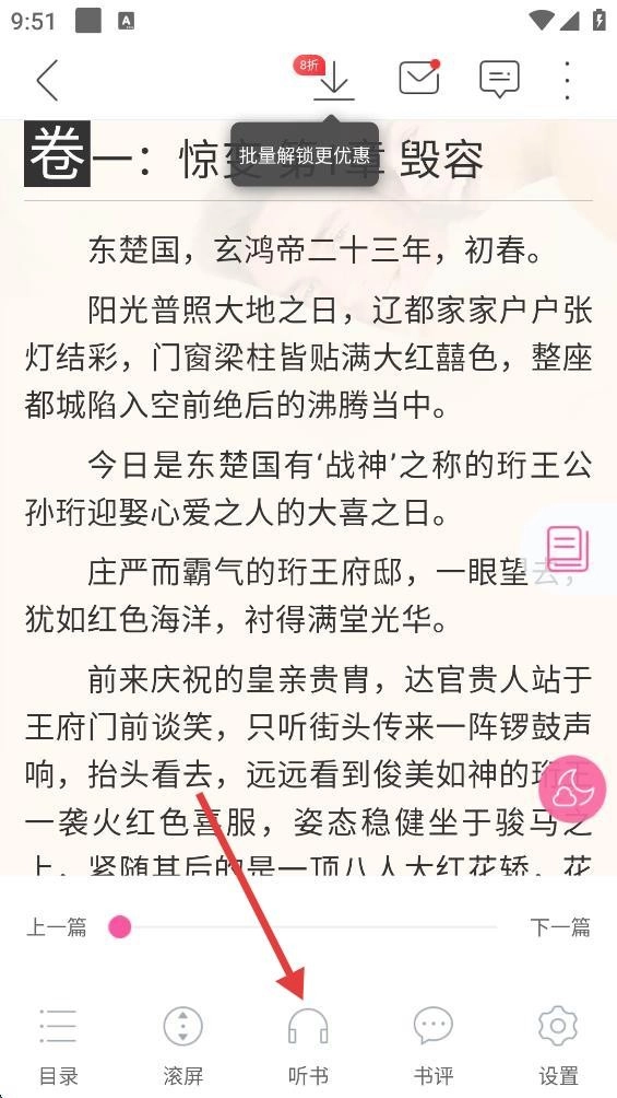 3、进入小说页面后,点击页面下方的听书图标,就能开始听书了