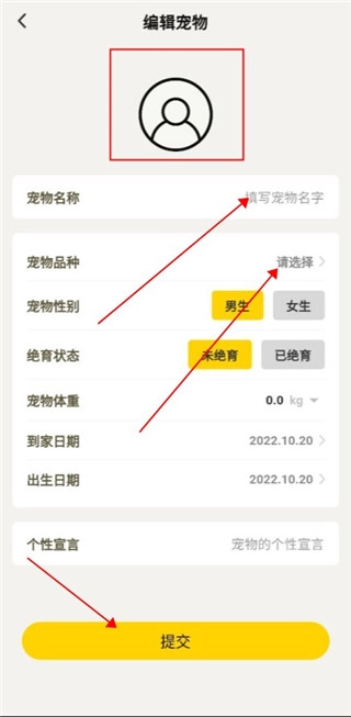 3、对宠物的头像、名字、品种、重量等相关信息进行编辑。
