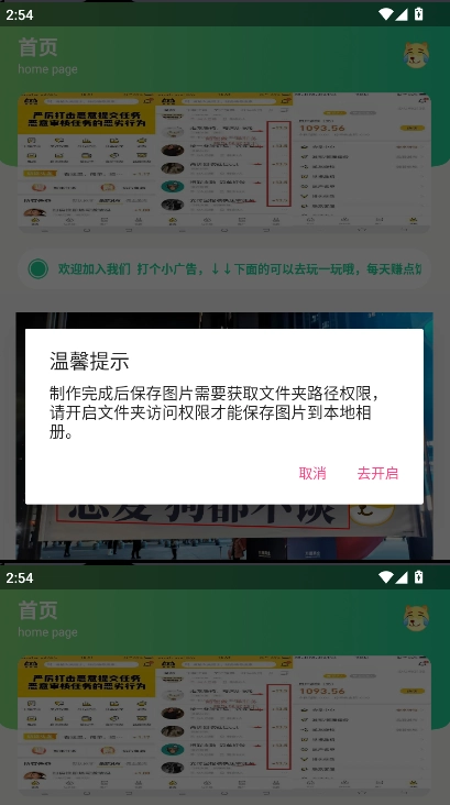 制作完成后保存图片时需要获取文件夹路径权限,请开启文件夹访问权限,这样才能将图片保存到本地相册。