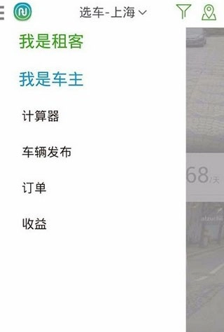 4、进入“我是车主”、“我是租客”、“个人中心”界面有两种方式:一是点击主页左上角的“三”图标;二是在主页屏幕从左往右滑动。需要注意的是,若要进入“个人中心”界面,需点击账户头像。