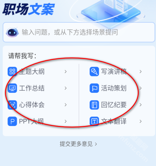 能依据主题大纲、工作总结、演讲稿等各类不同的类型,快速生成对应的方案,以此满足职场人士多方面的需求。