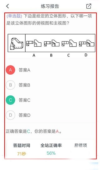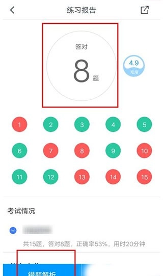4、届时会呈现一份练习报告,其中主要涵盖答对题目的数量、考试状况以及题目解析。倘若你想要查看错题,点击错题解析即可。