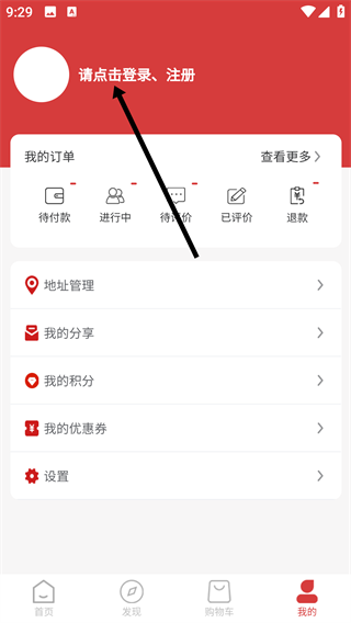 2、进入对应的页面后,点击【请点击登录、注册】区域完成账号相关操作,之后可以使用【我的订单】-【地址管理】等功能。