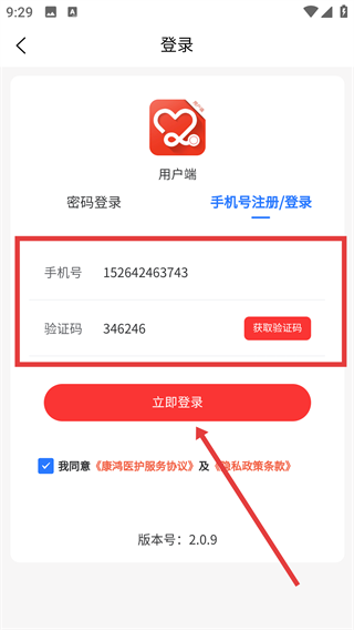 4、点击切换至【手机号注册/登录】标签页,依次填写【手机号】与【验证码】信息,勾选相关协议后,点击【立即登录】按钮即可。
