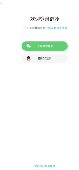3、在此处,你能够选择通过微信登录、QQ号码登录以及妙评账号登录。
