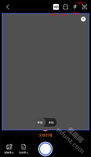 进入“文档扫描”功能后,您可通过页面右上角的设置选项调整画质像素、开启闪光灯或设置裁剪比例,从而获得理想的扫描效果。