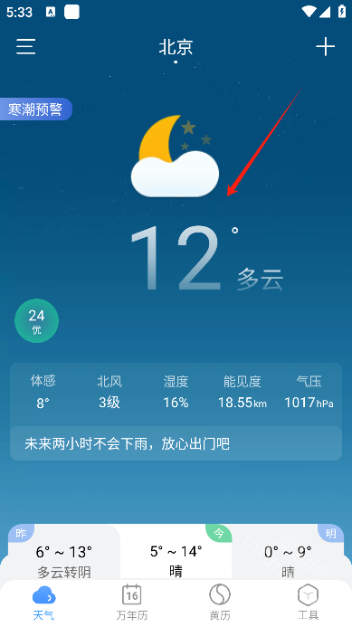 4、还向大家展示了当前地区的体感温度、湿度、气压、空气质量等信息