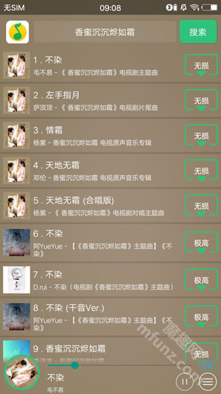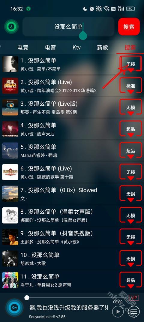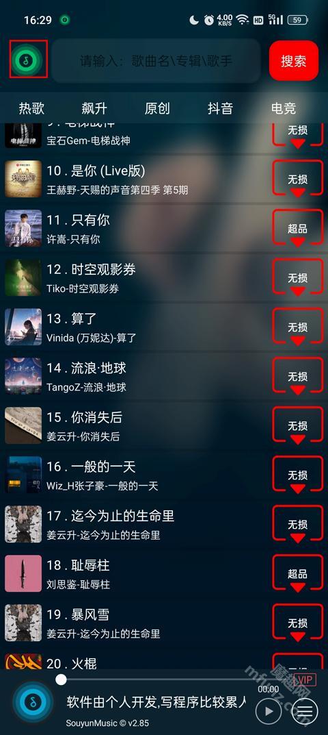 3、搜索到之后,点击这首音乐右边的无损按钮;