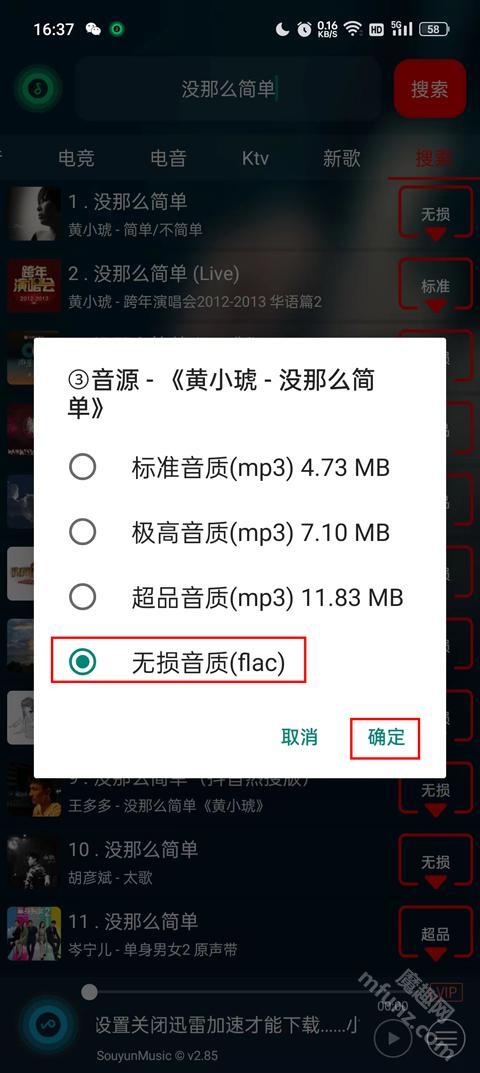 4、接下来会弹出音频品质的选择界面,选择无损音质后点击确定即可。