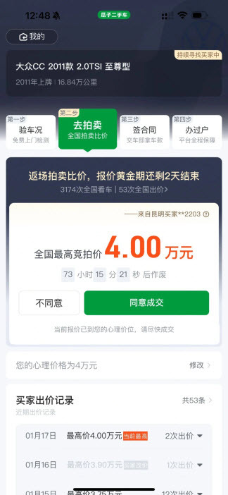 工作人员验完车后,第二天会给出报价。像我之前在瓜子平台上,验车后的报价是3.75万,我自己设置的拍卖底价是4万,后来有人成功拍下了(不过不是每次都能顺利成交,关键还是得看你定的价格合不合适)。