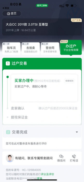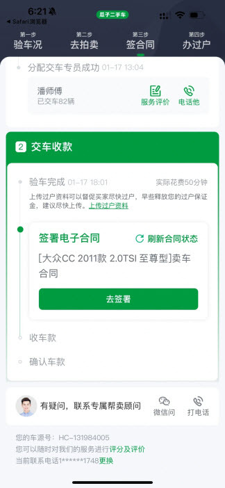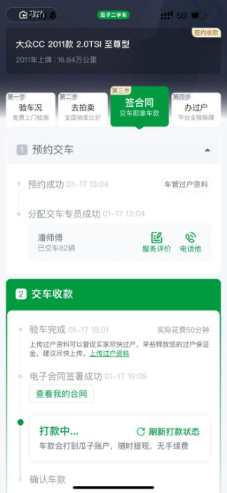 这一步,瓜子会安排工作人员上门进行复检并签订合同(这个复检环节还挺有意思的,工作人员全程和买家视频连线,买家说要看哪里就视频展示哪里,也没遇到小红书上提到的砍价情况,或许是因为买家在外地?不过整体体验挺好的,流程也很快,电子合同签好后大概半小时就收到钱了)