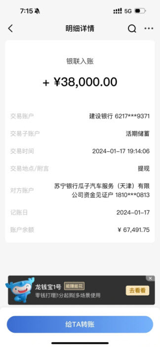 说明:收到的金额是38000,因为有2000被瓜子冻结了,等到过户完成后,会把2000打到我的账户。