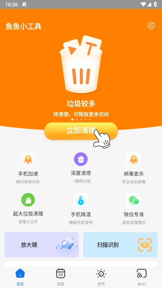 手机自带的工具不够用怎么办?那就试试鱼鱼小工具吧!它比手机自带工具更齐全,能一键完成手机清理、扫描识别,还有放大镜、日历天气等功能,每一款工具都很实用,日常生活和工作中都会用到,打开就能直接使用,体积小巧,能带来更多便利。