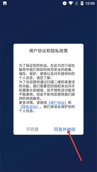1、在【用户协议和隐私政策】弹窗里,查看信息收集相关的权限说明后,点击【同意并继续】按钮,即可进入服务的功能界面。