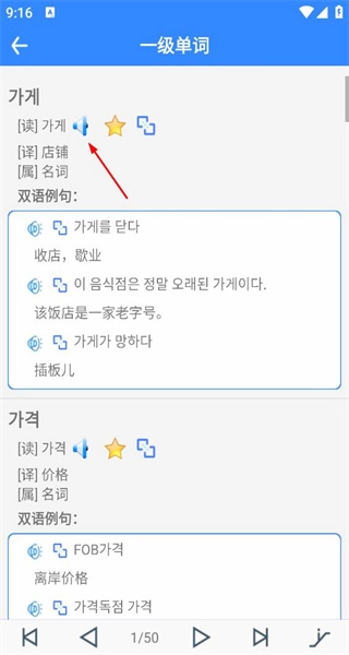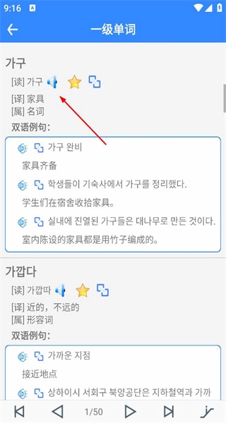 3、进入一级单词页面后,会呈现该单词的读音、释义与词性,同时搭配多条双语例句,单词旁边还设有收藏等功能操作按钮。