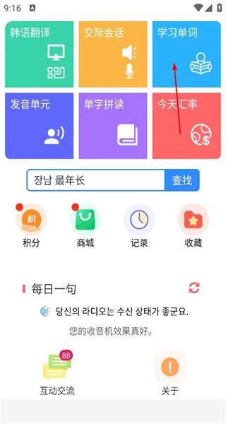 1、进入软件主界面,这里包含韩语翻译、交际会话等功能选项,还设有查找框以及积分商城等入口,界面底部则有每日一句板块。