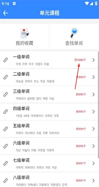 2、点击相应功能即可进入单元课程页面,该页面包含“我的收藏”和“查找单词”选项,同时列出了一级到八级的单词,每个等级都标注了对应的单词数量。