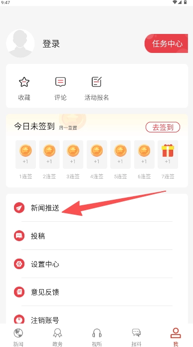 1、在首页我的页面选择新闻推送。