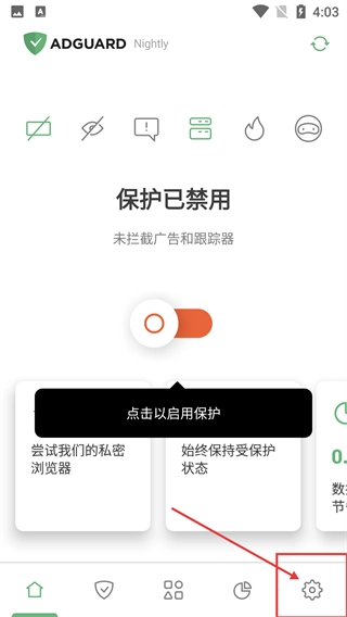1、在AdGuard界面(当前保护处于禁用状态),点击底部的【设置】按钮,即可进入设置页面,这款应用主要用于拦截广告和跟踪器。