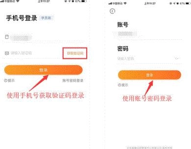 可以通过两种方式登录:一是用手机号获取验证码登录,二是使用参训短信中提供的账号和密码登录。