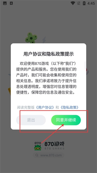 在870游戏的用户协议与隐私政策提示弹窗里,阅读完《用户协议》和《隐私政策》,点击【同意并继续】按钮,即可进入应用主界面。