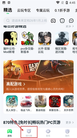 2、进入包含“云玩专区”“高配游戏”等板块的应用主界面后,点击底部的【排行榜】选项,即可进入游戏榜单页面。