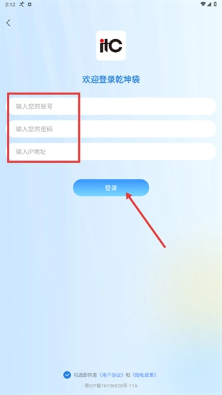 2、进入登录页面后,按顺序填写账号、密码和IP地址,仔细核对确保各项信息准确无误,随后点击【登录】按钮,即可完成账号登录操作。