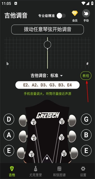 1、启动软件进入主界面后,选择标准调音模式,此时会显示出琴弦标识,接着点击教程按钮,即可进入调音使用教程页面。