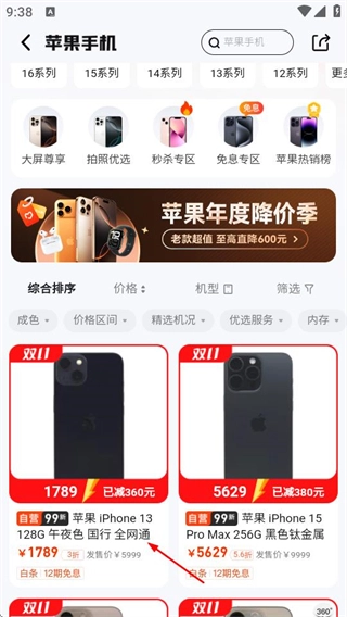 3、在列表页面,点击你喜欢的苹果手机(比如苹果iPhone13),就能进入商品详情页面。