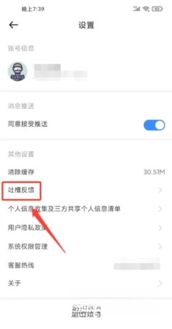 2、在设置页面中,选择【吐槽反馈】选项。
