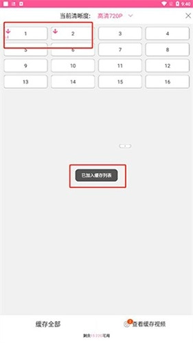 3、进入缓存设置界面后,先选定画质等级,接着点击想要缓存的具体集数,把它添加至缓存队列里。