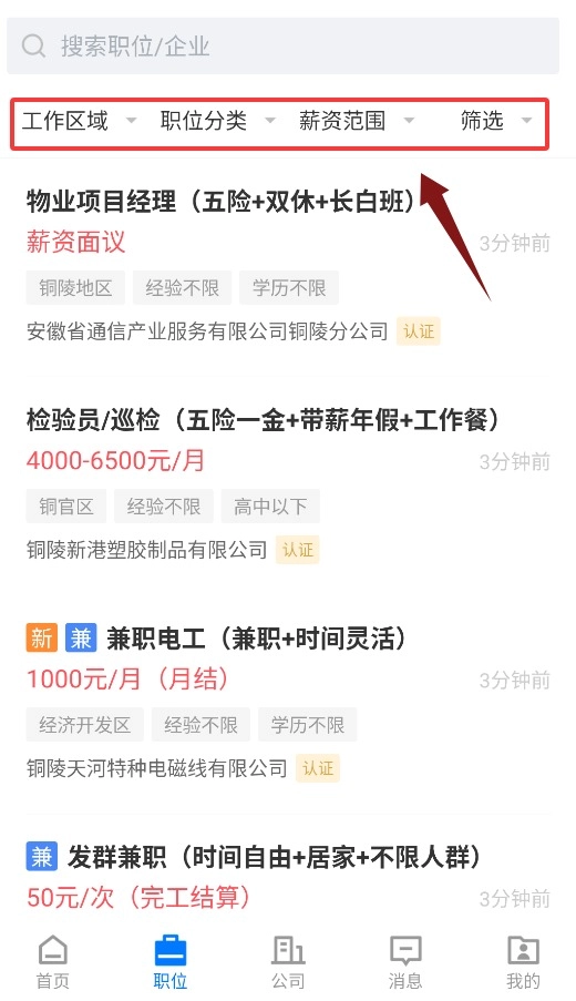 3、职位界面支持按工作区域、职位分类、薪资范围等条件进行筛选。