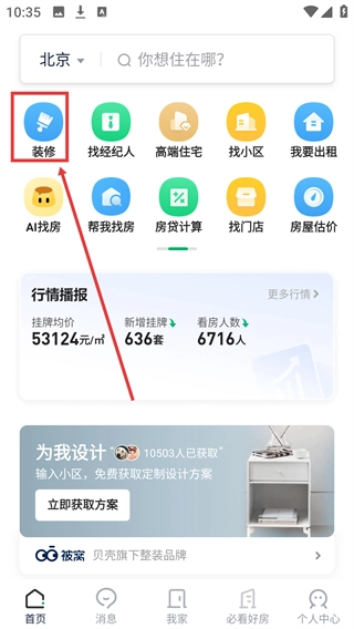 1、在首页点击【装修】功能按钮,进入被窝家装相关页面,可查看装修报价、量房等装修服务。