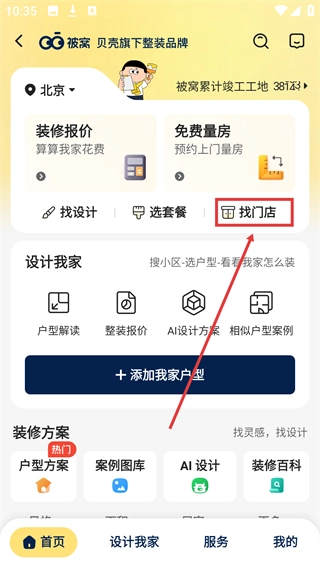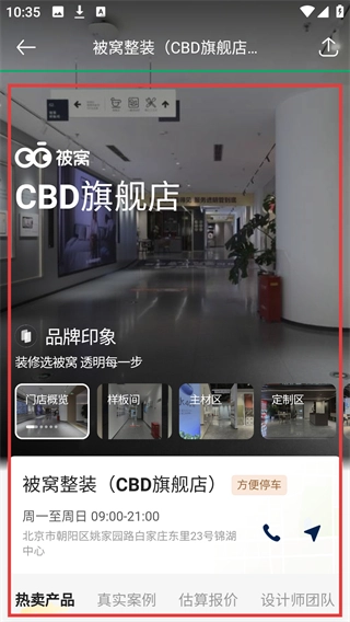 2、进入装修页面后,点击【找门店】选项,切换至被窝家装体验店列表,可查看相关门店信息。