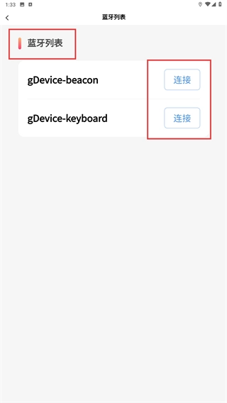 4、在蓝牙列表,选择目标设备(如“gDevice-beacon”“gDevice-keyboard”),点击对应【连接】按钮完成设备配对。