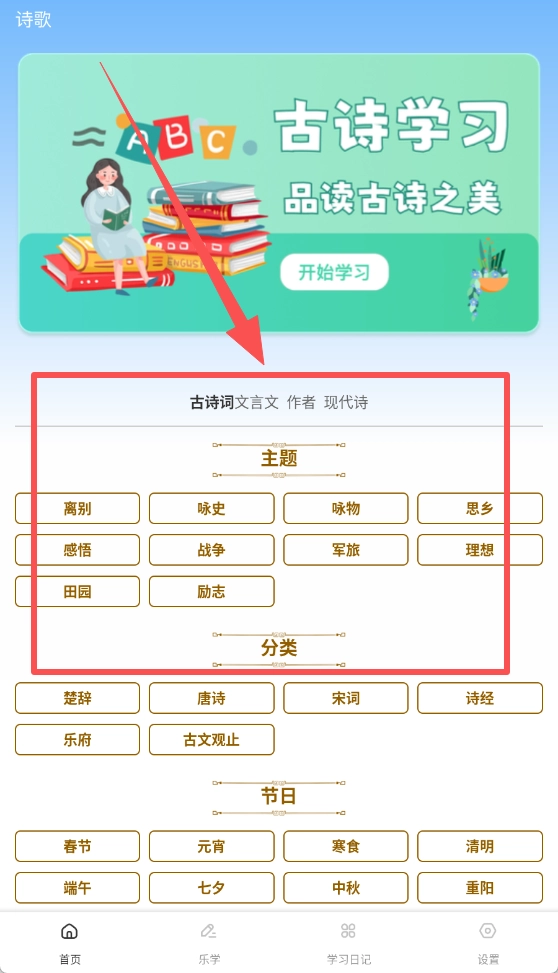 2、软件设有十分不错的游戏乐园挑战,包含大量精选诗词作品赏析与学习内容,敬请享受,该平台还拥有实用的学习日记工具。