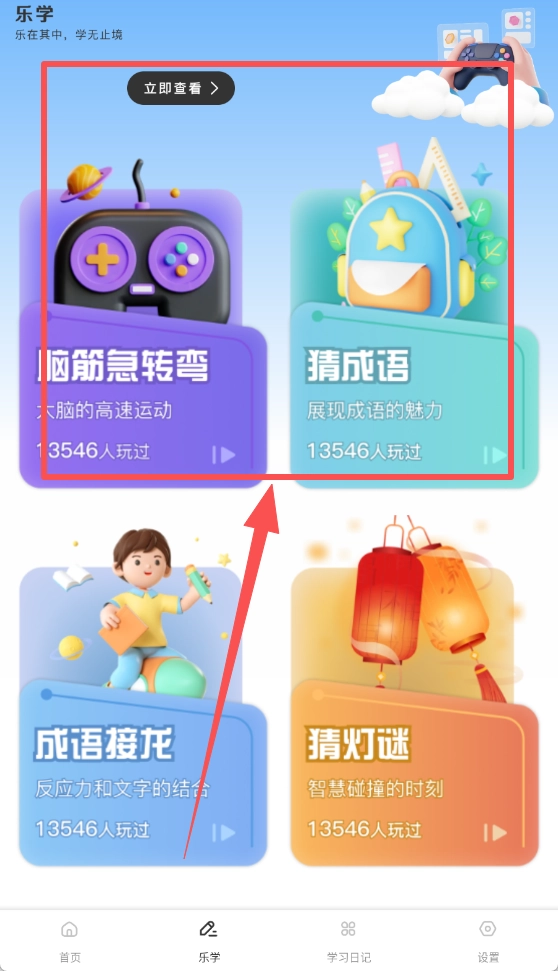 2、可以在乐学内参与不同的活动,可以选择参与脑筋急转弯、猜成语等小游戏,丰富学习内容。
