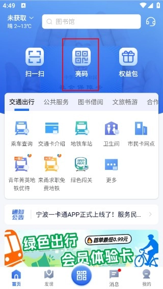 1、在宁波一卡通首页,点击顶部功能栏中的【亮码】选项,进入社保卡服务页面。