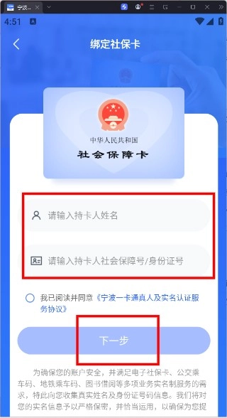 3、在绑定社保卡页面,依次输入相关信息,勾选服务协议后,点击【下一步】按钮,进入人脸验证环节。