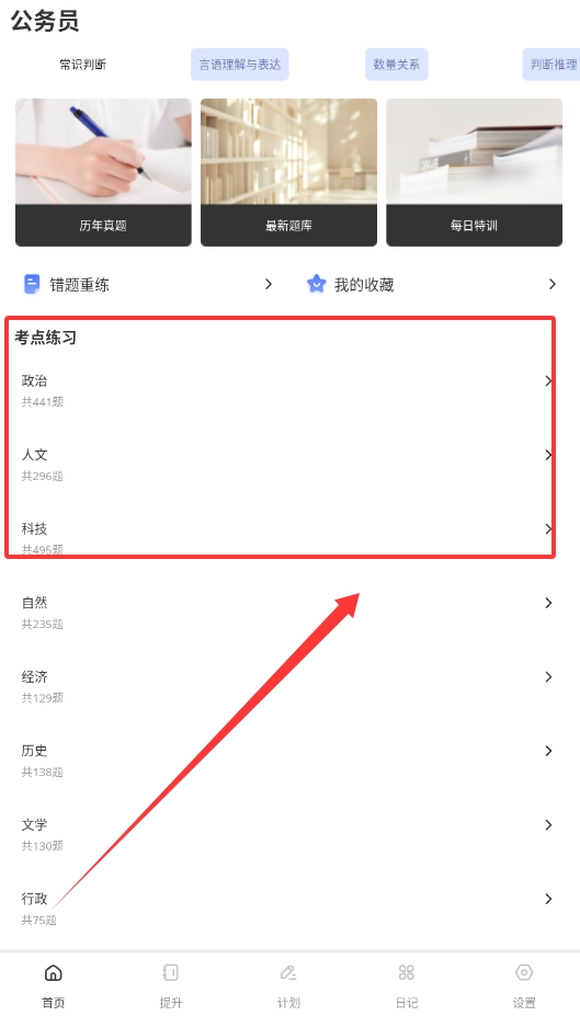 1、打开软件进入首页,就能看到常识判断、言语理解等各个备考板块了哟。