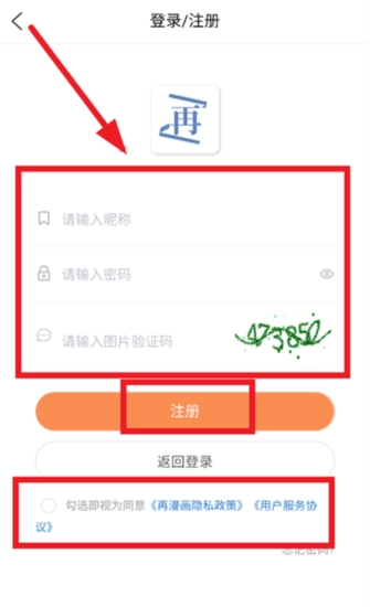4.请输入昵称、密码和图片验证码,勾选同意《再漫画隐私政策》与《用户服务协议》后,点击注册按钮即可完成注册。